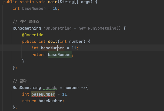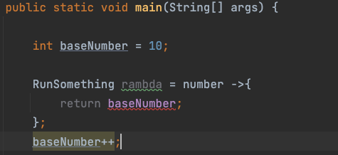 public static void main(String[] args) { int baseNumber = 10; RunSomething rambda = number ->{ return baseNumber; }; } - effective final
