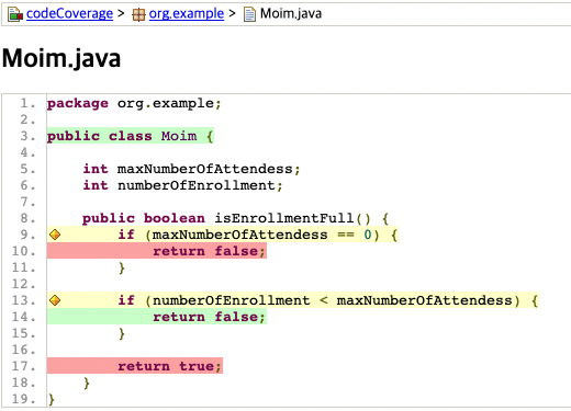 false인 조건을 만족하는 테스트 코드가 없어서 17라인이 실행이 안 되었고 일부 조건만 테스트되어 노란색으로 표시되어 있습니다.