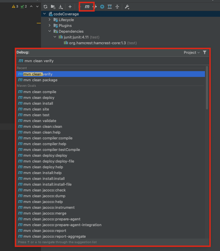 위 사진처럼 M 버튼을 클릭하시고, mvn clean verify 입력 후 엔터를 치시면 됩니다.
