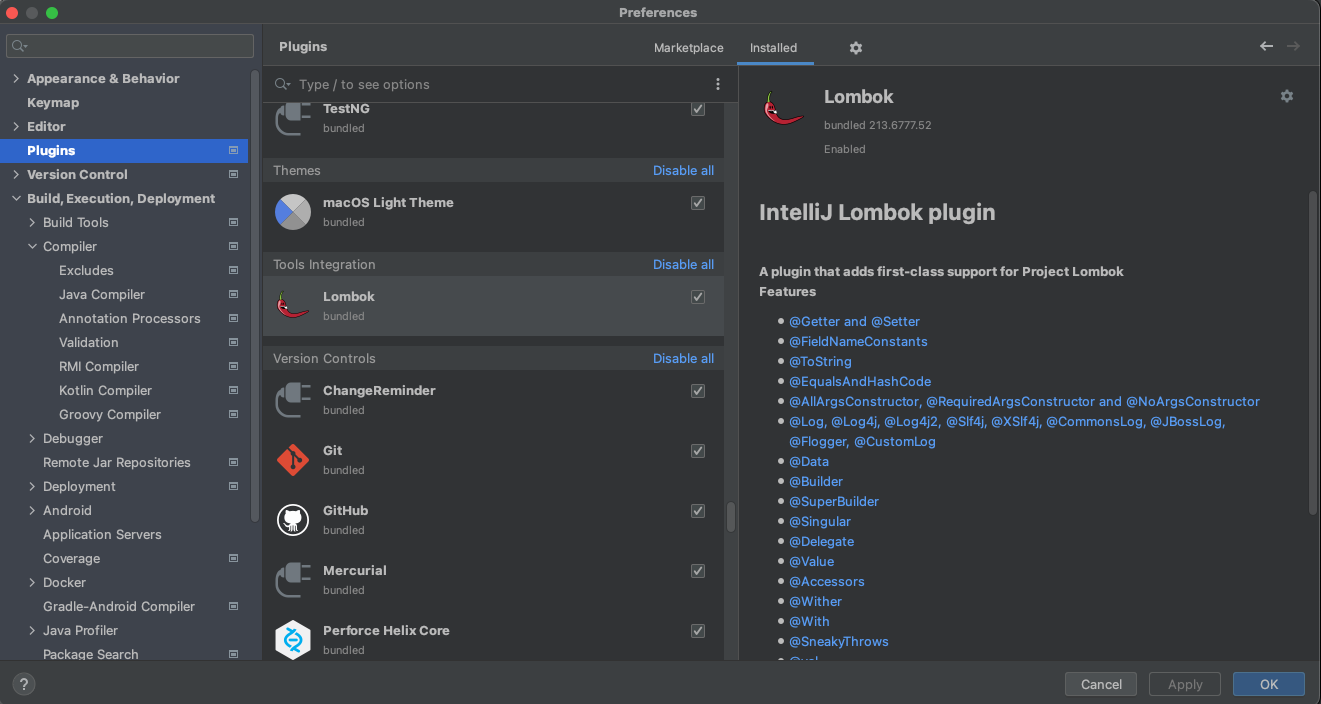Preferences -> Plugins설정에서 IntelliJ Lombok 플러그인을 설치합니다.